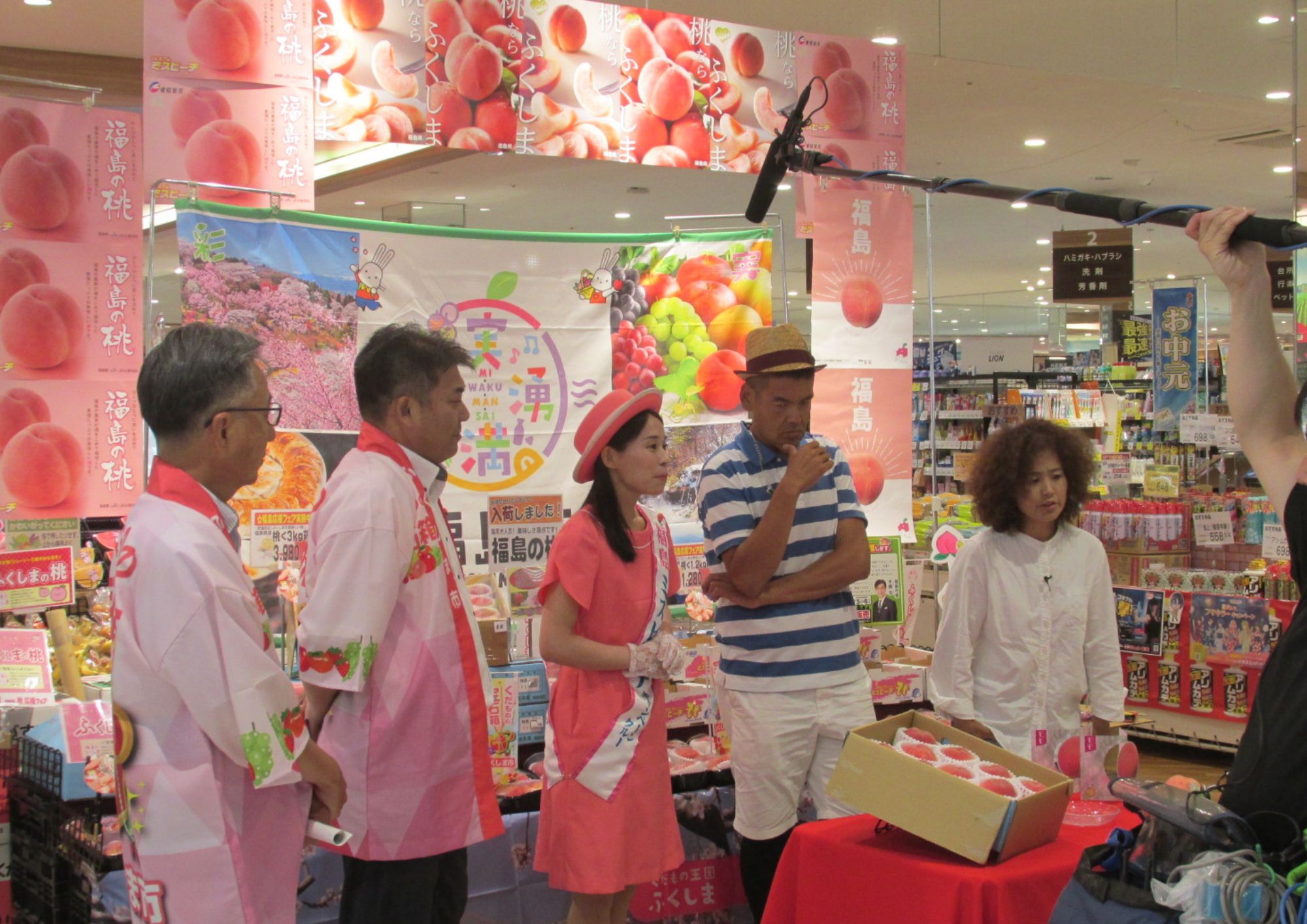 福島市の職員やJAの職員がミスピーチキャンペーンクルーとともにテレビ山口の取材を行けている様子です