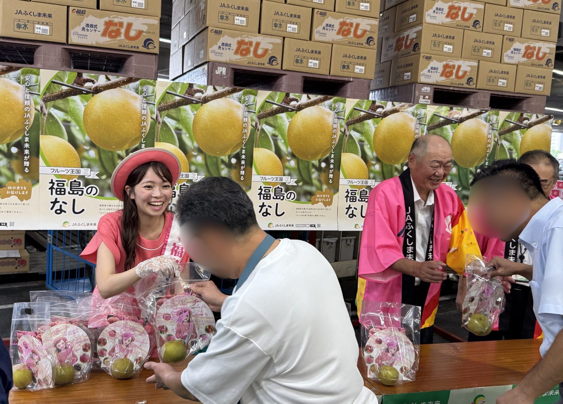 大果大阪青果でミスピーチキャンペーンクルーがナシと桃の形をしたうちわを配布している様子です