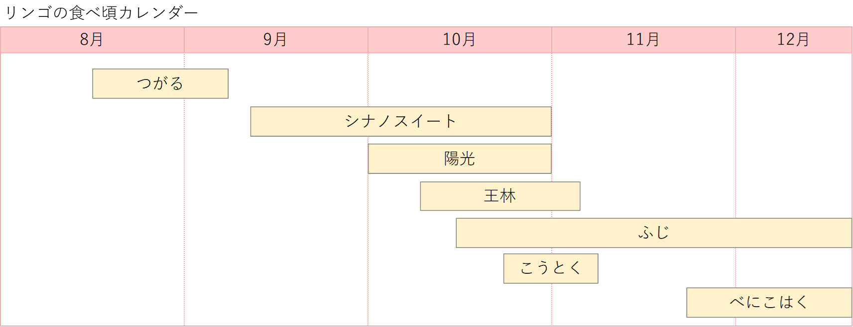 9月は甘くてさわやかな、つがる、10月は甘くてジューシーなシナノスイート、黄緑で風味のある王林、11月に蜜入りのふじが収穫されます。そして11月の下旬から12月上旬にかけて、甘酸が味わえる蜜たっぷりのべにこはくが続きます。
